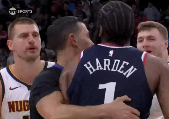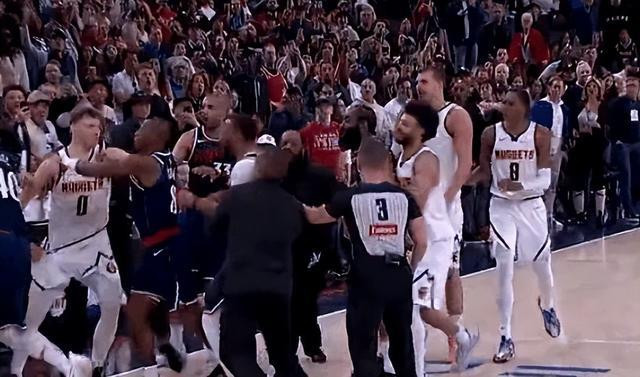 随着约基奇的加入,冲突进一步升级。阿龙·戈登见状,也冲动地想要冲上去与哈登理论。两人之间发生了推搡,相互之间都有推搡的动作。这一幕让整个球场的气氛更加紧张,球迷们的心也随之提到了嗓子眼。