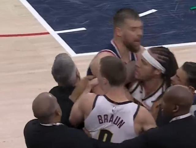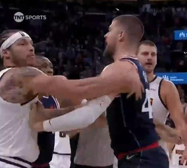 布劳恩和哈登之间的争执迅速升级,双方的情绪开始失控。布劳恩的表情变得紧张而严肃,他的肢体语言充满了挑衅。此时,约基奇这位联盟中的硬汉,毫不犹豫地冲上前去,加入了这场争斗。他的介入明显加剧了冲突的激烈程度,场上局势瞬间变得剑拔弩张。